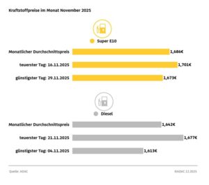 München (ots) – Tanken hat sich im November im Vergleich zum Oktober teils spürbar verteuert. Während die Fahrer von Benziner-Pkw einen Preisanstieg von 1,4 Cent je Liter hinnehmen mussten, kletterte der Dieselpreis…