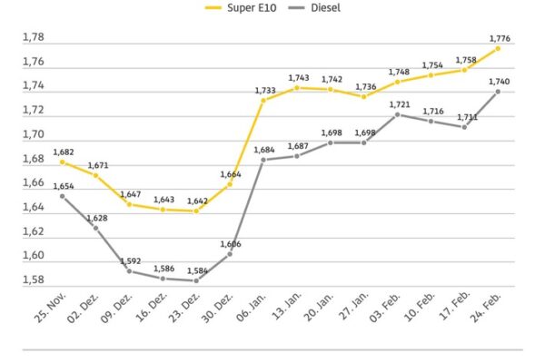 Kraftstoffpreise so hoch wie zuletzt 2024 / Diesel fast drei Cent teurer als in der Vorwoche / Benzinpreis steigt um 1,8 Cent / Ölpreis vier US-Dollar höher