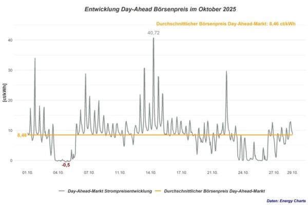 Hamburg (ots) – – Durchschnittlicher Börsenstrompreis im Oktober: 8,46 ct/kWh – Zwei windreiche Phasen drücken die Strompreise zeitweise auf Nullniveau…