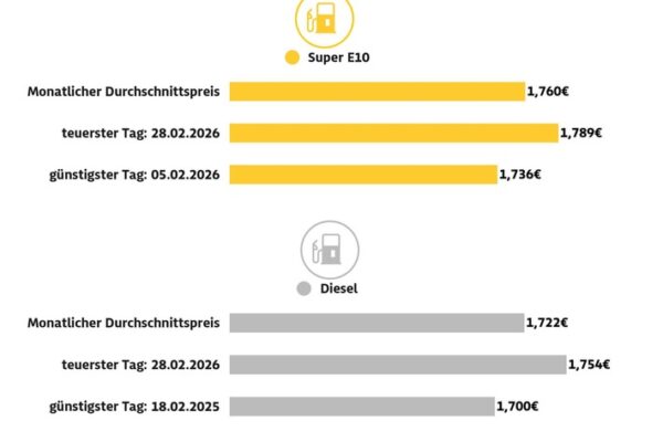 • Benzin und Diesel im Februar teurer als im Vormonat / Super E10 2,1 Cent teurer, Diesel 3 Cent / 28. Februar teuerster Tag des Monats / Krieg im Nahen Osten dürfte Spritpreise kräftig steigen lassen