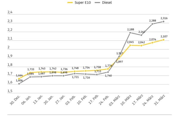 Diesel im März 2026 im Durchschnitt so teuer wie noch nie / Diesel kostete im März im Schnitt 2,164 Euro, Super E10 2,022 Euro / Österreichmodell führt zu Preisaufschlägen von fast acht Cent um 12 Uhr
