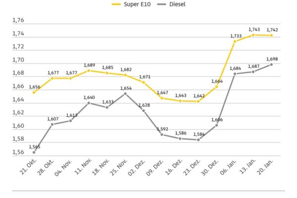 Dieselpreis steigt, Benzin nahezu gleichbleibend / Rohölpreis seit der Vorwoche unverändert / Starke Verteuerung gegenüber Vorjahrespreisen